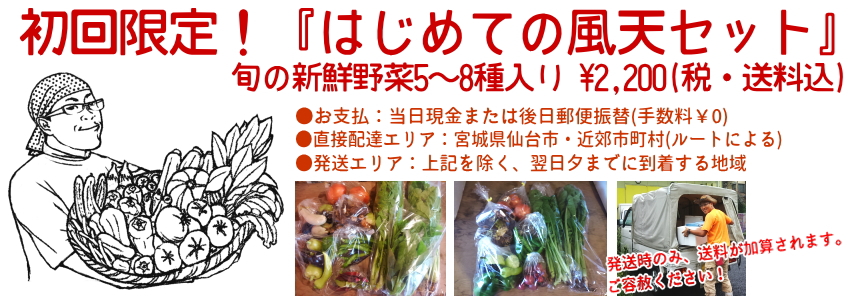 「はじめての風天セット」では、農薬・化学肥料を使っていない、その時期の旬の野菜を、初回限定のお試し価格でお召し上がりいただけます!お申し込みは、こちらのメールフォーム から、住所・郵便番号・氏名・電話番号を明記の上で「はじめての風天セット下さい!」とお問い合わせください。